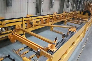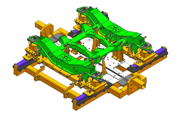 該工裝用于350公里動車組車體底架的翻轉(zhuǎn),將底架鋼結(jié)構(gòu)翻轉(zhuǎn)一定角度,使得焊縫處于平焊位置,而且配合設(shè)計可以電動升降的小車,從而方便焊接操作,保證焊接質(zhì)量。